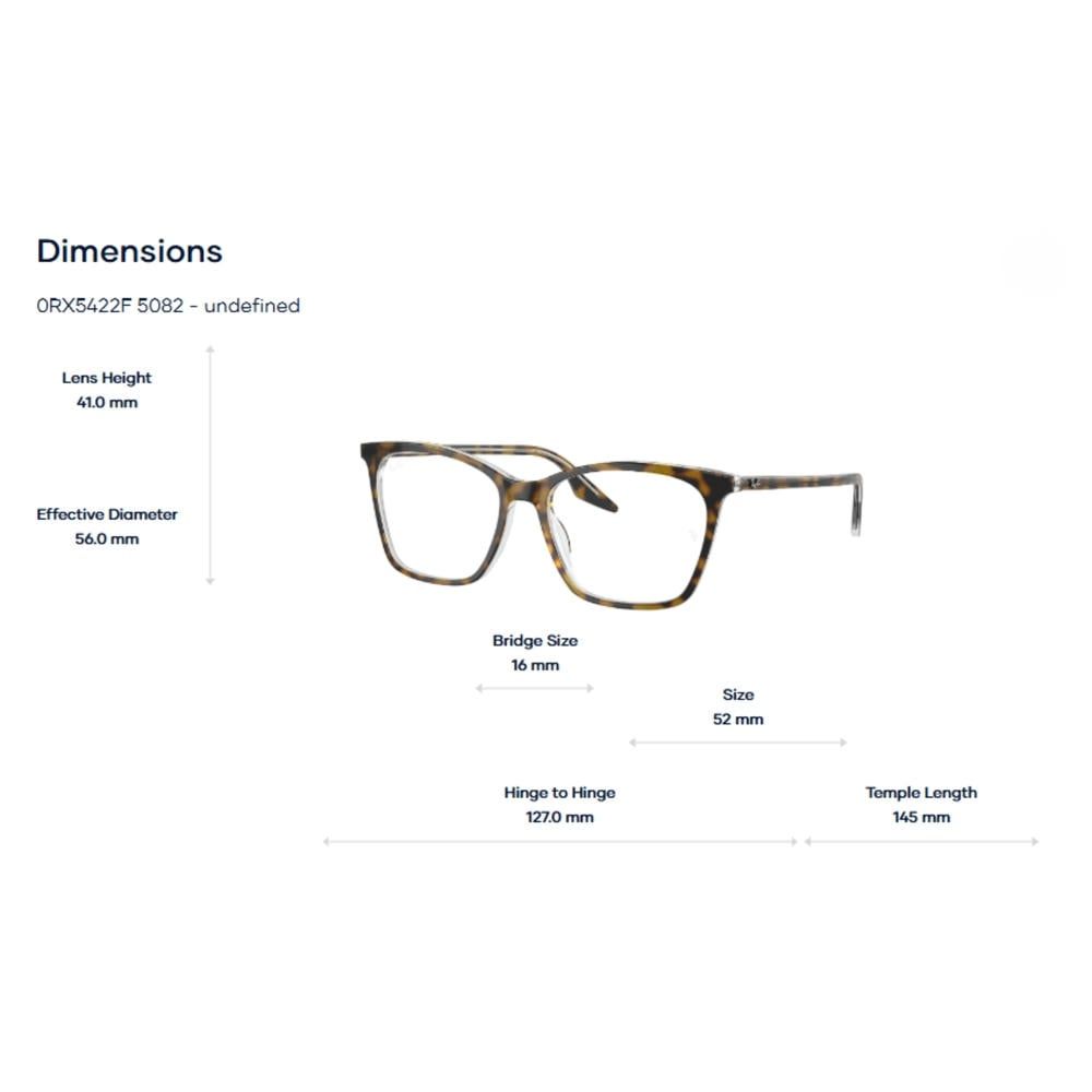 Với kích thước 52–16–145 mm, RayBan 0RX5422F thuộc nhóm gọng có form trung bình, ôm gọn khuôn mặt nữ. Cầu kính vừa phải giúp kính ngồi ổn định, hạn chế trượt khi đeo lâu.