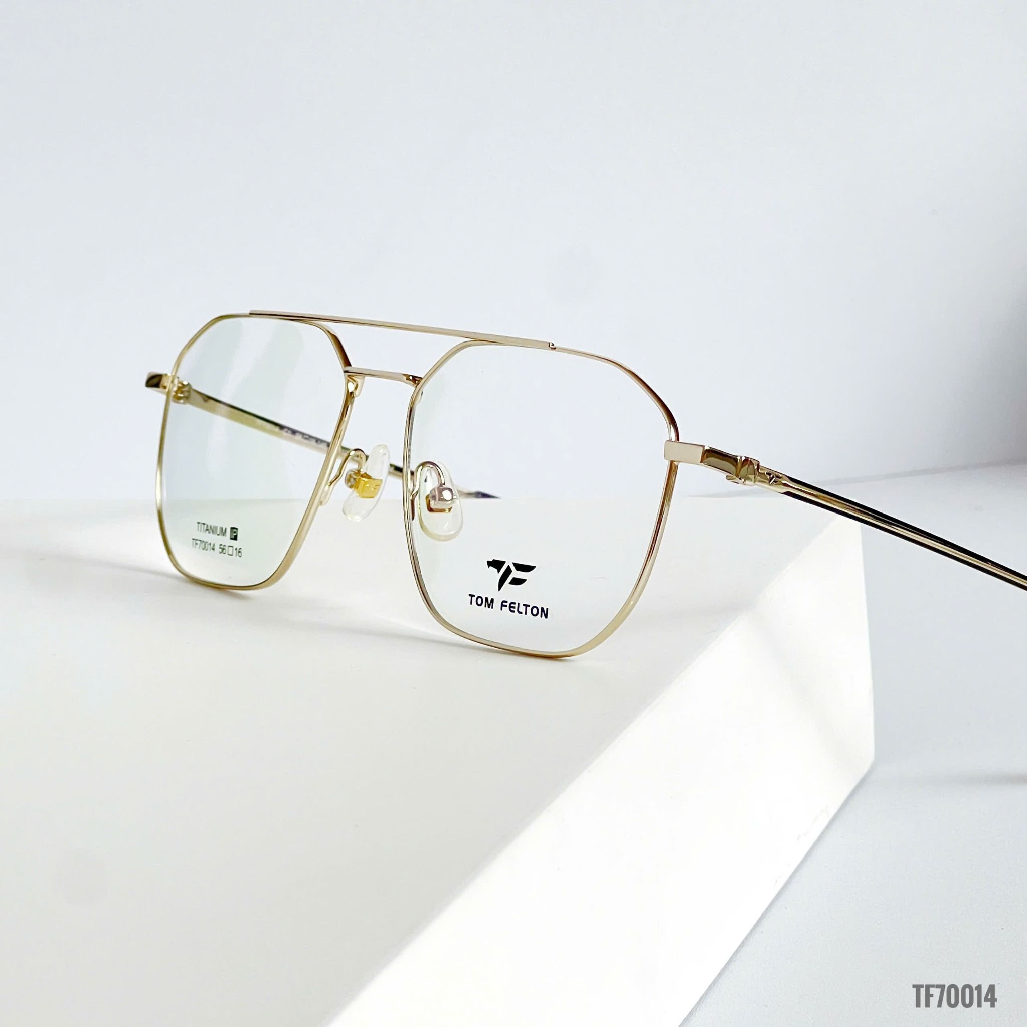 Logo Tom Felton được in khắc tinh tế ở cả tròng kính và càng kính, tạo điểm nhấn nhẹ nhàng mà vẫn giữ được phong thái cao cấp. Đệm mũi silicon trong suốt giúp kính ôm mũi thoải mái, chống trượt hiệu quả.