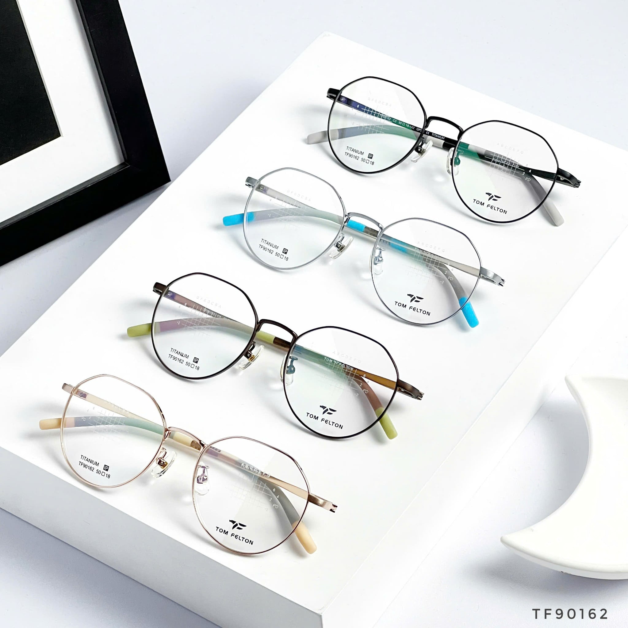 Mỗi phiên bản TF90162 được phối màu tinh tế ở phần càng kính như xanh mint, xanh dương pastel, nâu, be hoặc đen – tạo cảm giác trẻ trung, cá tính mà vẫn giữ được độ thanh lịch. Logo Tom Felton in sắc nét trên tròng kính chính là dấu hiệu nhận diện hàng chính hãng.
