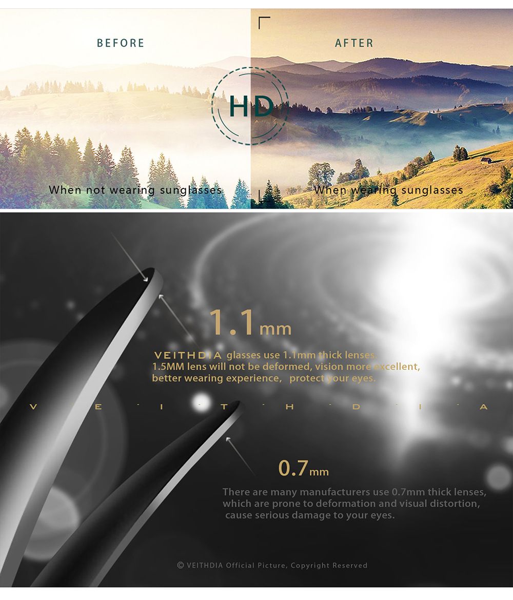 Tròng kính bằng chất liệu polycarbonate siêu bền siêu nhẹ, chống nứt vỡ như các loại kính cao cấp khác. Chứ không phải tròng kính bằng gương rẻ tiền, vừa nặng mà lại rủi ro văng miểng khi nứt vỡ.
