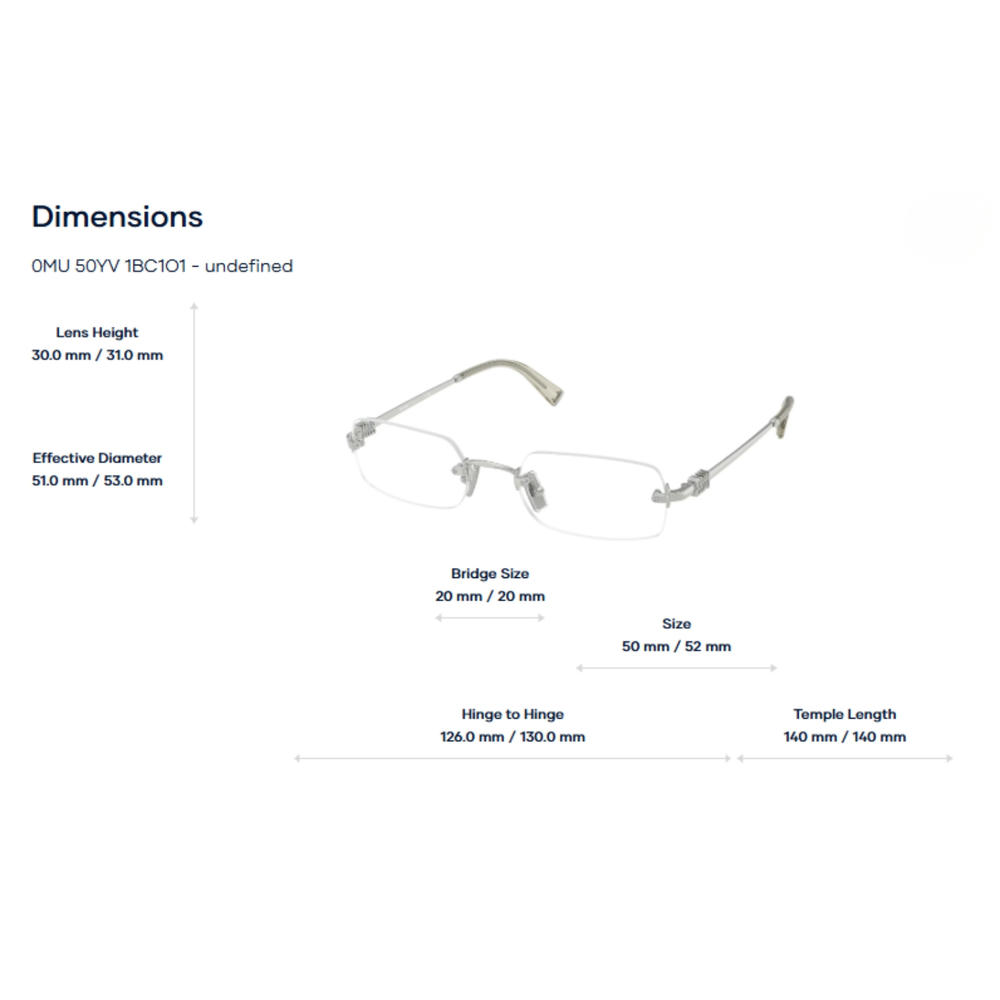 Với kích thước 50/52–20–140 mm, Miu Miu 0MU 50YV mang lại độ vừa vặn lý tưởng, không gây nặng mũi hay cấn tai khi đeo lâu. Càng kính ôm tai nhẹ nhàng, giúp kính giữ vị trí ổn định trong sinh hoạt hằng ngày.