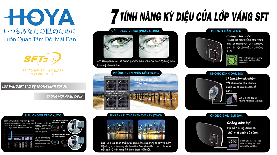 SFT là lớp váng phủ đa năng, giúp giảm chói, chống trầy xước, hạn chế bám bụi và dầu nhờn, đồng thời nâng cao độ tương phản hình ảnh. Đây là giải pháp toàn diện giúp bảo vệ tròng kính cũng như trải nghiệm thị giác của người dùng trong mọi điều kiện ánh sáng.