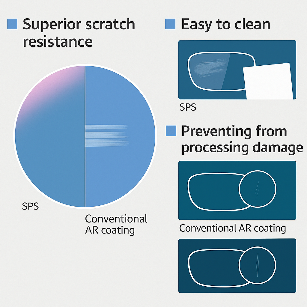 Qua các thử nghiệm minh họa, tròng kính phủ SPS cho thấy khả năng chống xước và kháng bám bẩn vượt trội hơn rõ rệt so với lớp phủ chống phản xạ (AR) truyền thống. Ngoài ra, lớp phủ SPS còn giảm tỷ lệ trầy xước trong quá trình mài lắp tròng, giúp duy trì chất lượng kính tốt hơn ngay cả sau khi gia công.