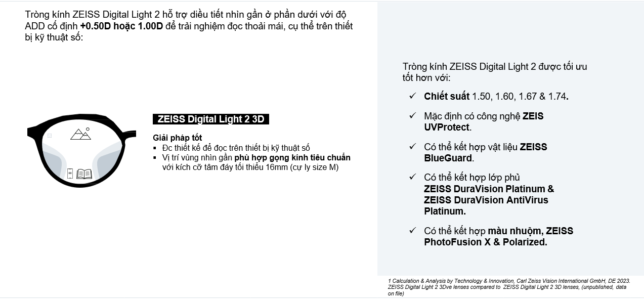 Hỗ trợ điều tiết 3D: Thay vì một tiêu cự phẳng, thiết kế 3D cá nhân hóa giúp mắt chuyển đổi tiêu cự từ xa sang gần cực kỳ nhẹ nhàng.