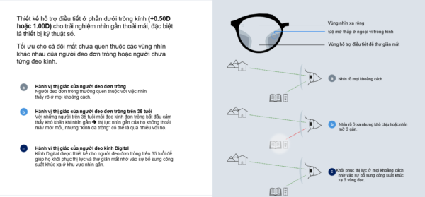 Công nghệ Zeiss EasyFocus: Tập trung hỗ trợ vùng nhìn gần (mức ADD từ +0.50D đến +1.00D), giúp cơ mắt thư giãn tối đa khi đọc tin nhắn hoặc lướt tablet trong nhiều giờ.