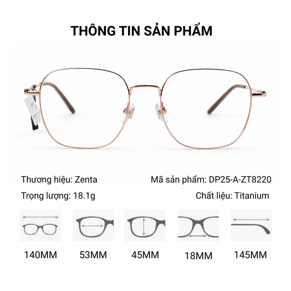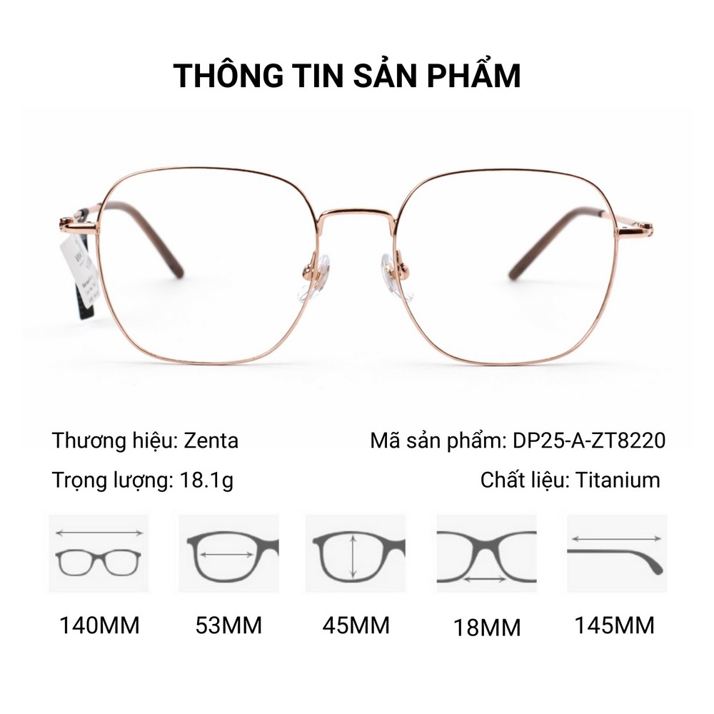 Với thông số 53 – 18 – 145 mm, gọng kính đa giác Zenta DP25-A-ZT8220 có độ rộng mắt kính 53mm – một kích thước trung bình lý tưởng, không quá to cũng không quá nhỏ. Cầu kính rộng 18mm giúp kính ôm sát và cân đối trên nhiều dáng mũi khác nhau, trong khi càng kính dài 145mm đảm bảo độ bám chắc chắn nhưng vẫn rất êm ái.